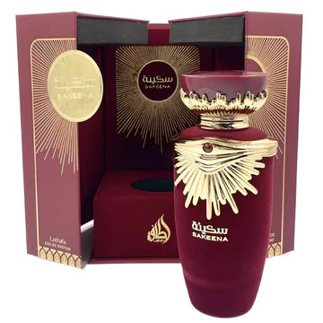 Sakeena by Lattafa Perfumes is a Floral Fruity Gourmand fragrance for women. This is a new fragrance. Sakeena was launched in 2022. Top notes are Passionfruit, Mandarin Orange and Ozonic notes; middle notes are Raspberry, Rose, Orange Blossom and Sea Salt; base notes are Praline, Toffee, Musk and Vanilla.